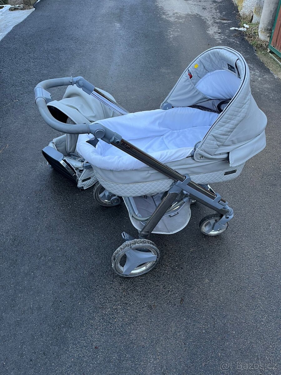 Prodám použitý kožený kočárek Bébécar, limitovaná edice, trojkombinace (korbička, sportovní sedačka, autosedačka)