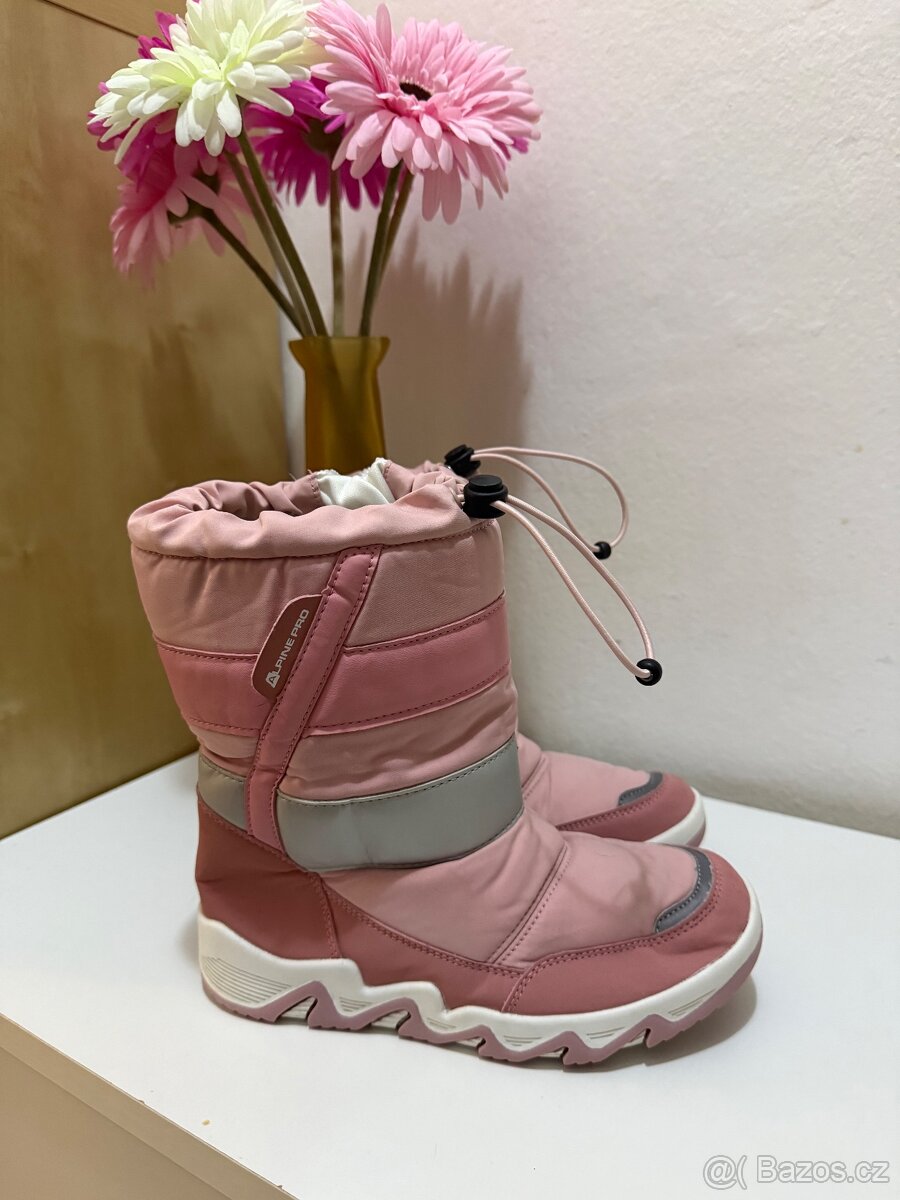 Nabízím zimní sněhule růžové barvy zn. Alpine vel. 35 na zip lze i utáhnout pomocí gumiček u vršku sněhulek, má razicí reflexy. Botky viz. Foto