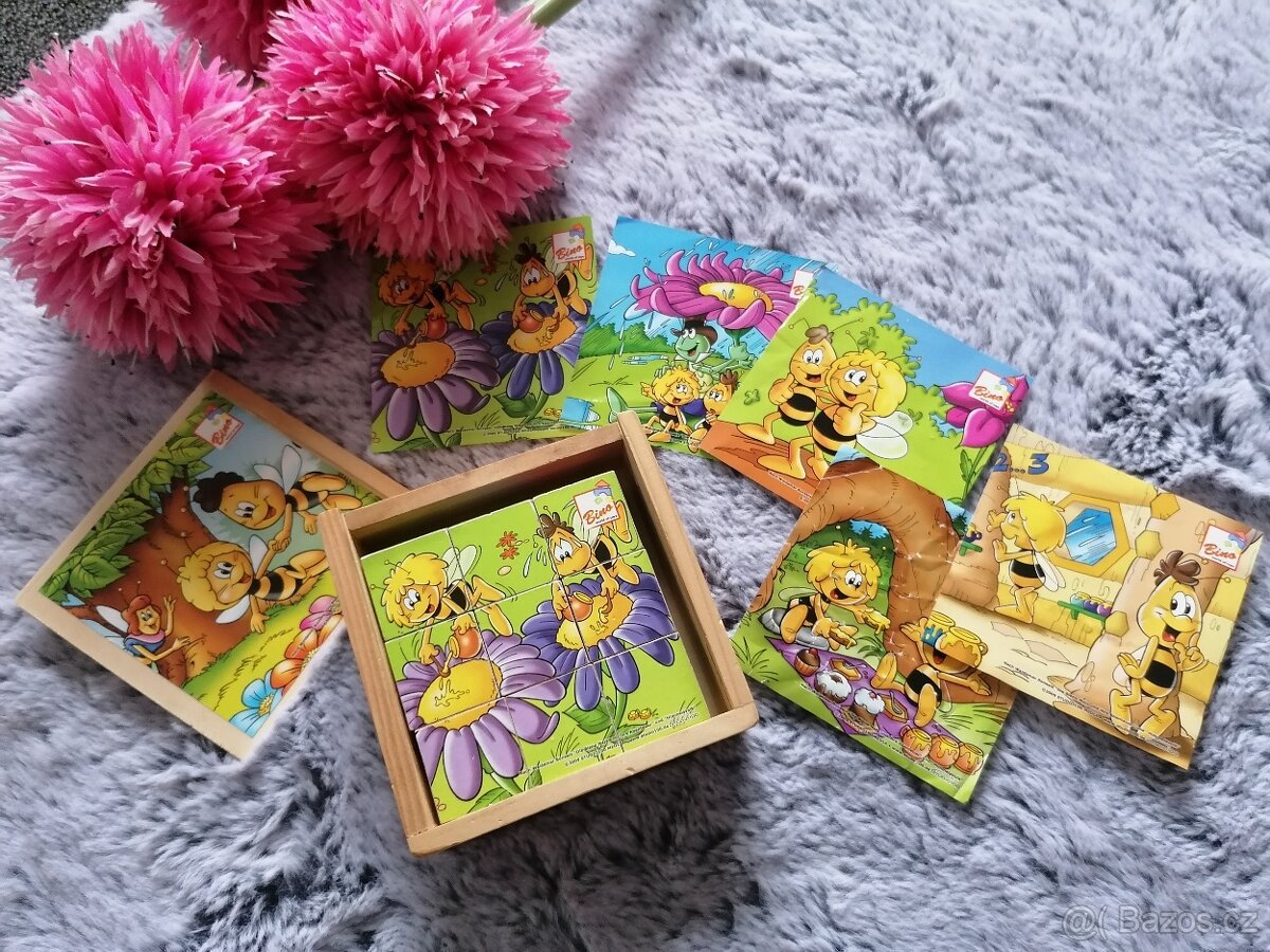 Dřevěné kostky Včelka Mája v dřevěné krabičce, zn. Bino. Kostky jsou hrané, ale stále pěkné. Obrázky jsou všechny, jen jeden pokrčený (viz.foto), jak se zasouvalo víčko, tak se trochu pokrčil. Mrkněte i na mé ostatní nabídky, nabízím toho více!