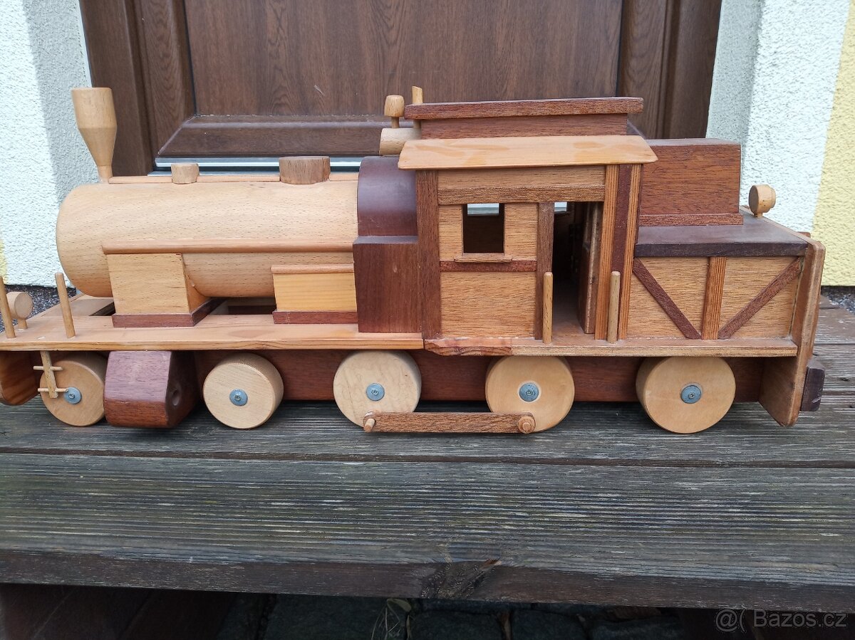 Prodám dřevěnou lokomotivu, otevírací dveře, rozměry 72cm na 25cm. Dohoda