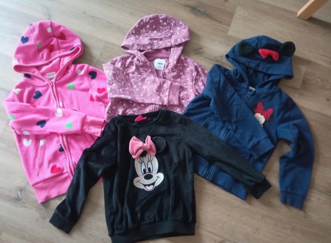 Prodám po dcére mikiny nošené velikost 116, práci šmolek na srdíčkove mikine rukávy viz foto.