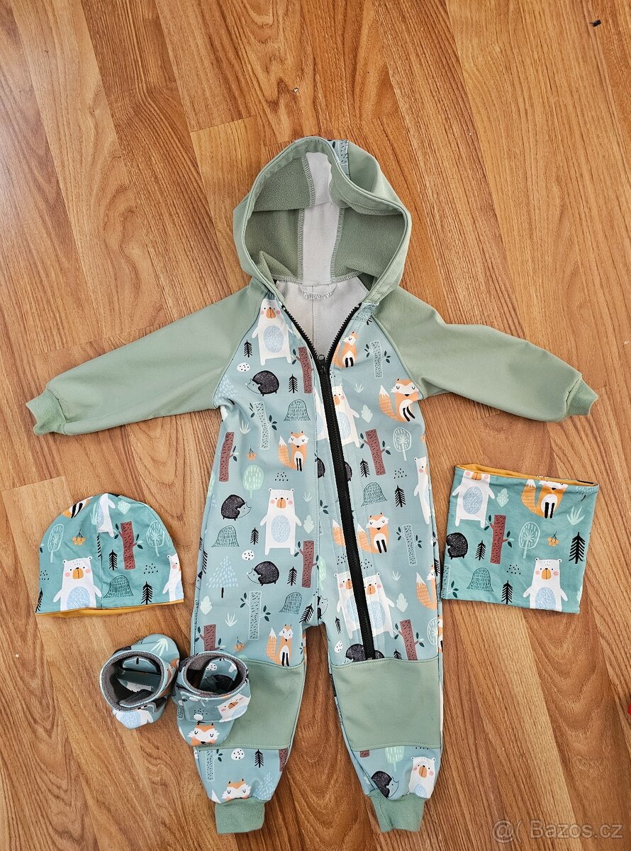 Softshell set - overal, čepice, nákrčník a botky. Málo nošené, top stav. Velikost cca 86-92.