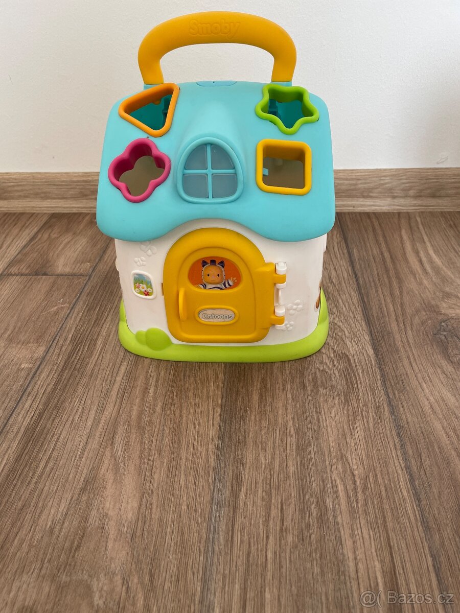 Při vložení správného tvaru do příslušného otvoru ve střeše, se rozsvítí okno a začne hrát hudba nebo se aktivuje zvuk. Součástí domečku jsou 4 barevné kostičky různých tvarů. Pro snadnější přenos má domeček na střeše madlo.