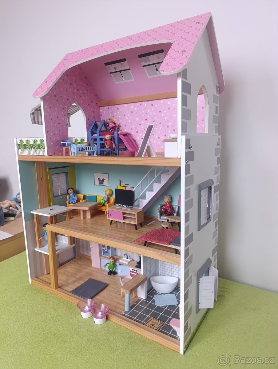 Prodám domeček pro panenky včetně veškerého příslušenství a figurek (k domečku dokoupeny sady figurek a nábytku navíc). Funkční výtah, dveře, okenice, dokonce i svítící lustry (nutno znovu přilepit). Jinak běžné opotřebení (viz. foto). Domeček byl hojně využíván, neležel v krabici, ale dcerka se o něj docela pěkně starala. 🙂 Cena za komplet tak, jak je na fotkách, je 700 Kč. Po dohodě možno přijet osobně prohlédnout/vyzvednout.