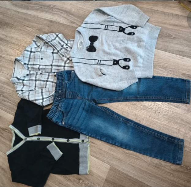 - krásná měkoučká lehčí flanelové košile Zara - svetřík s kšandami a motýlkem C&A - lehká slušná černá mikina na knoflíky (bez cedulky, ale myslím, že F&F) - džíny s gumou a šňůrkou v pase
