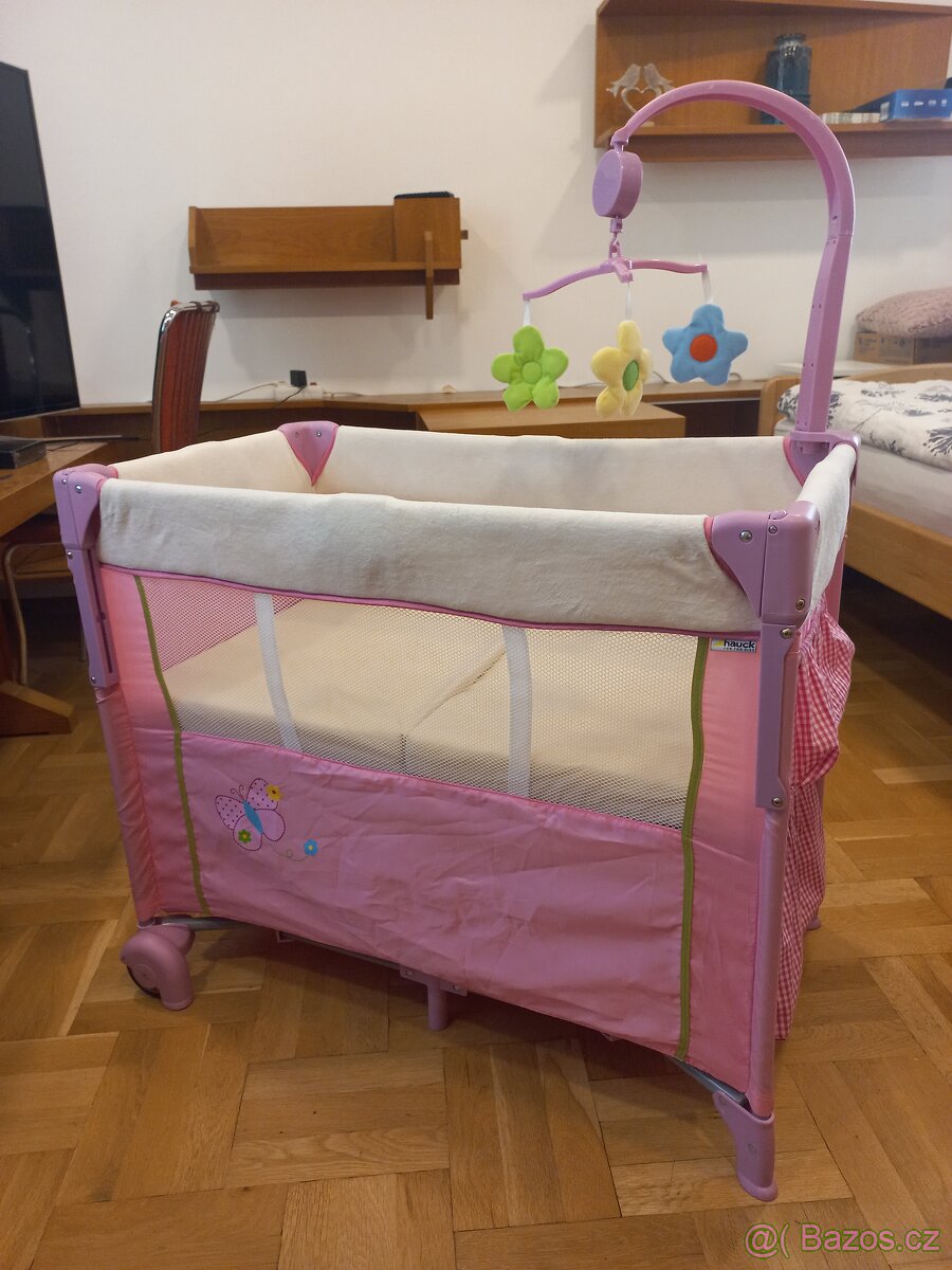 Prodám cestovní postýlku pro děti od 0 měsíců do 9 kg. Vnitřní rozměr 81x46cm,matrace 5cm,rozložená 89x51x76cm,složená 75x24x24cm,taška na přenášení,váha 7,7kg.Stahovací bok,venkovní kapsy,hrací kolotoč+brouček.Pěkná,zachovalá,lehká.Dohoda jistá.