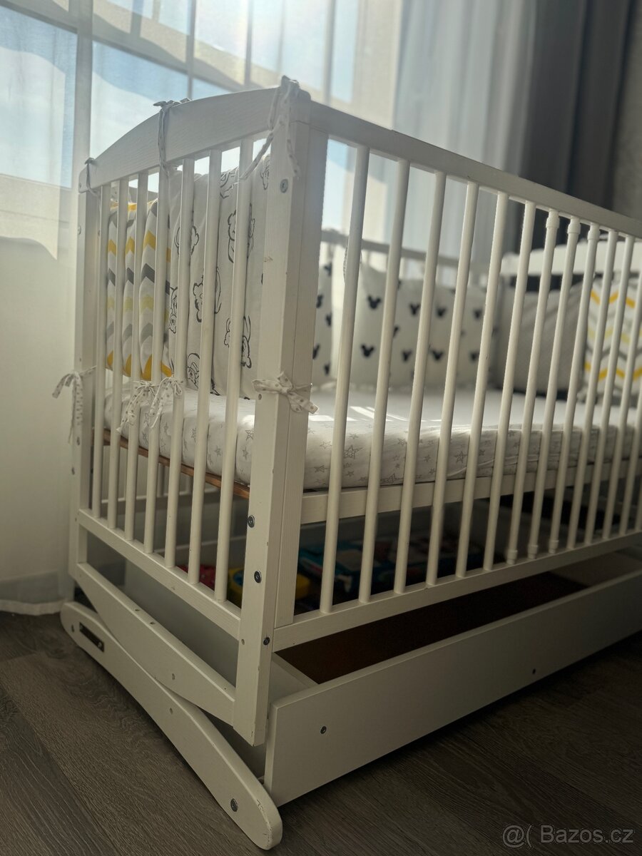 Prodám dětskou postýlku s funkcí houpání. Postýlka má aretaci, takže ji lze jednoduše zafixovat proti houpání. Ve spodní části je praktický šuplík na uložení věcí.