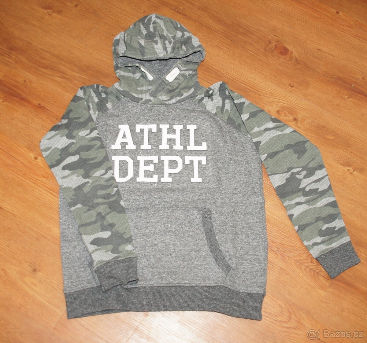 Šedá chlapecká mikina s maskáčovými rukávy značky C&A. Velikost uvedena 146 - 152, ale řekla bych, že bude lépe sedět velikosti 140 - 146. Mikina je přes hlavu, má kapuci a na břiše jednu velkou kapsu. Nápis je plastický. Délka zadního dílu (měřeno uprostřed) je 53 cm, šířka v průramcích je 47 cm.