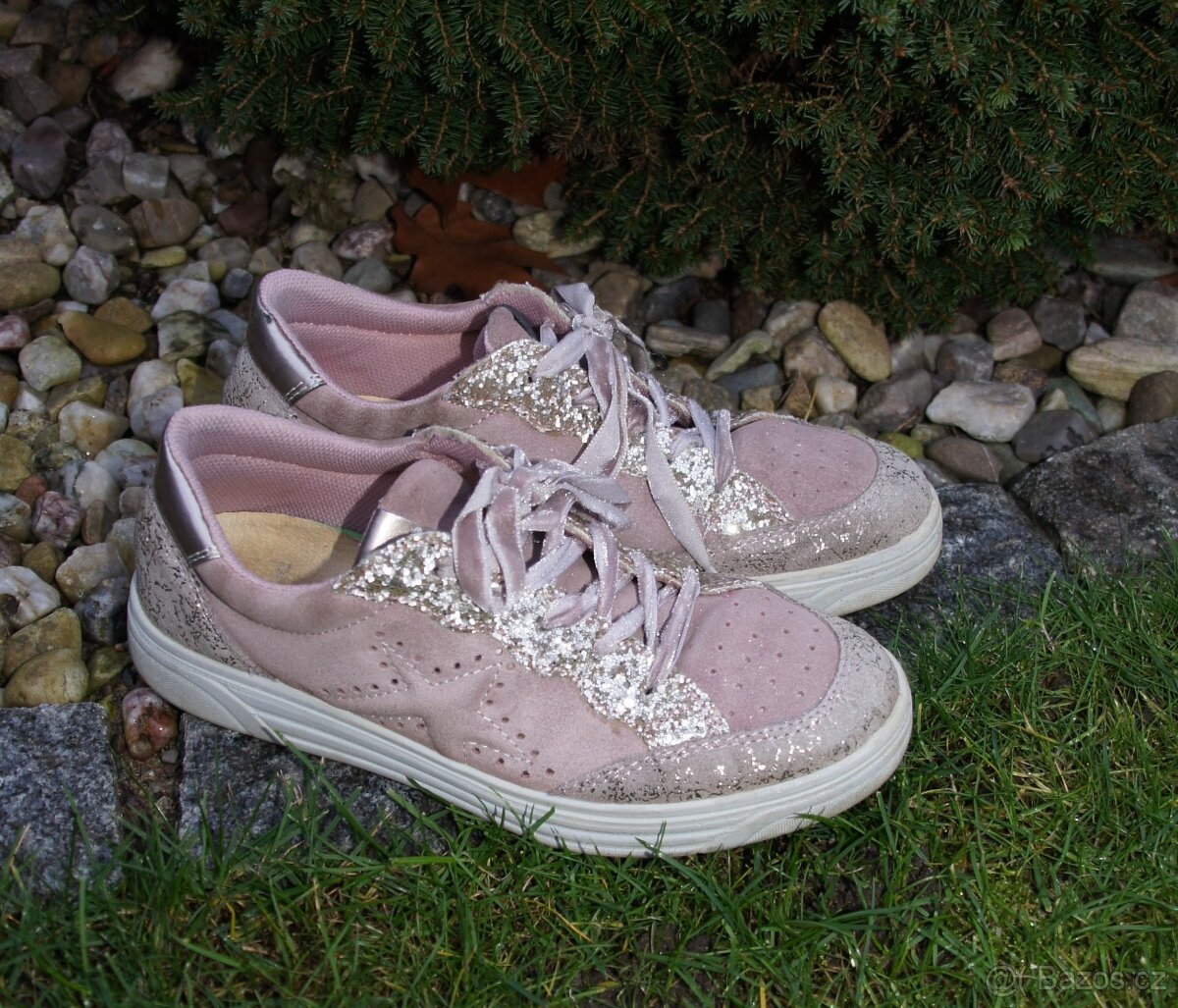 Dívčí růžové boty se třpytkami značky Primigi, velikost 35. Vnitřní stélka je kožená. Boty se hodí ke kalhotám i k sukni.