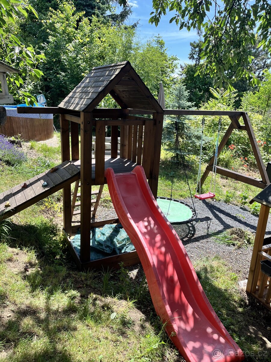 Nabízím k prodeji velké dětské hřiště se skluzavkou 2m, místo na dvě houpacky (kulatou houpačku si necháváme) piskoviste a lezecka stěna s uchyty. Hřiště bylo využíváno 2 roky. Rozměry základny jsou 3,5m x 2m.