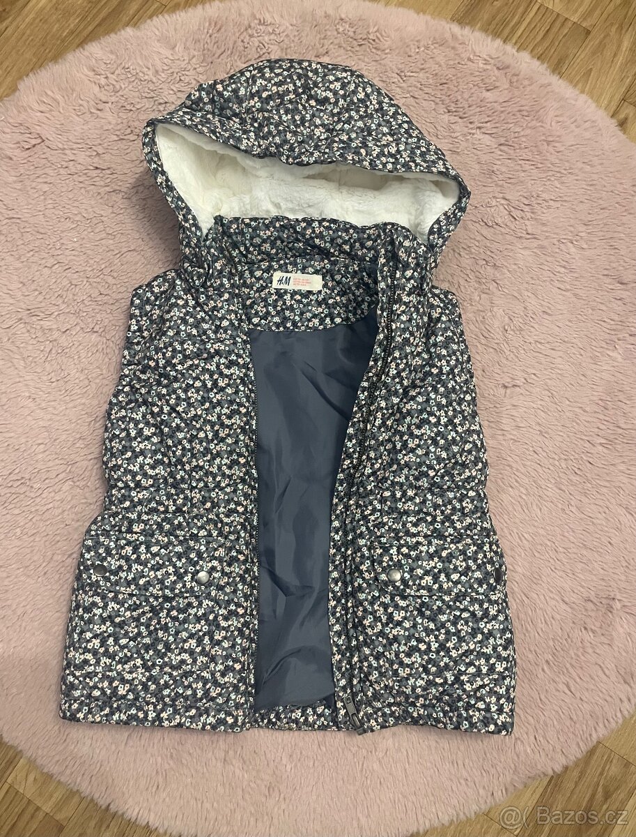 Vesta Grace vel. 104 - [20.2. 2026]Teplá s fleesem. Malý flíček. Udaná Vel. 110 , ale je menší, proto píšu 104, ale dala by se nosit i dřív. Kapuce a pásek lze sundat.