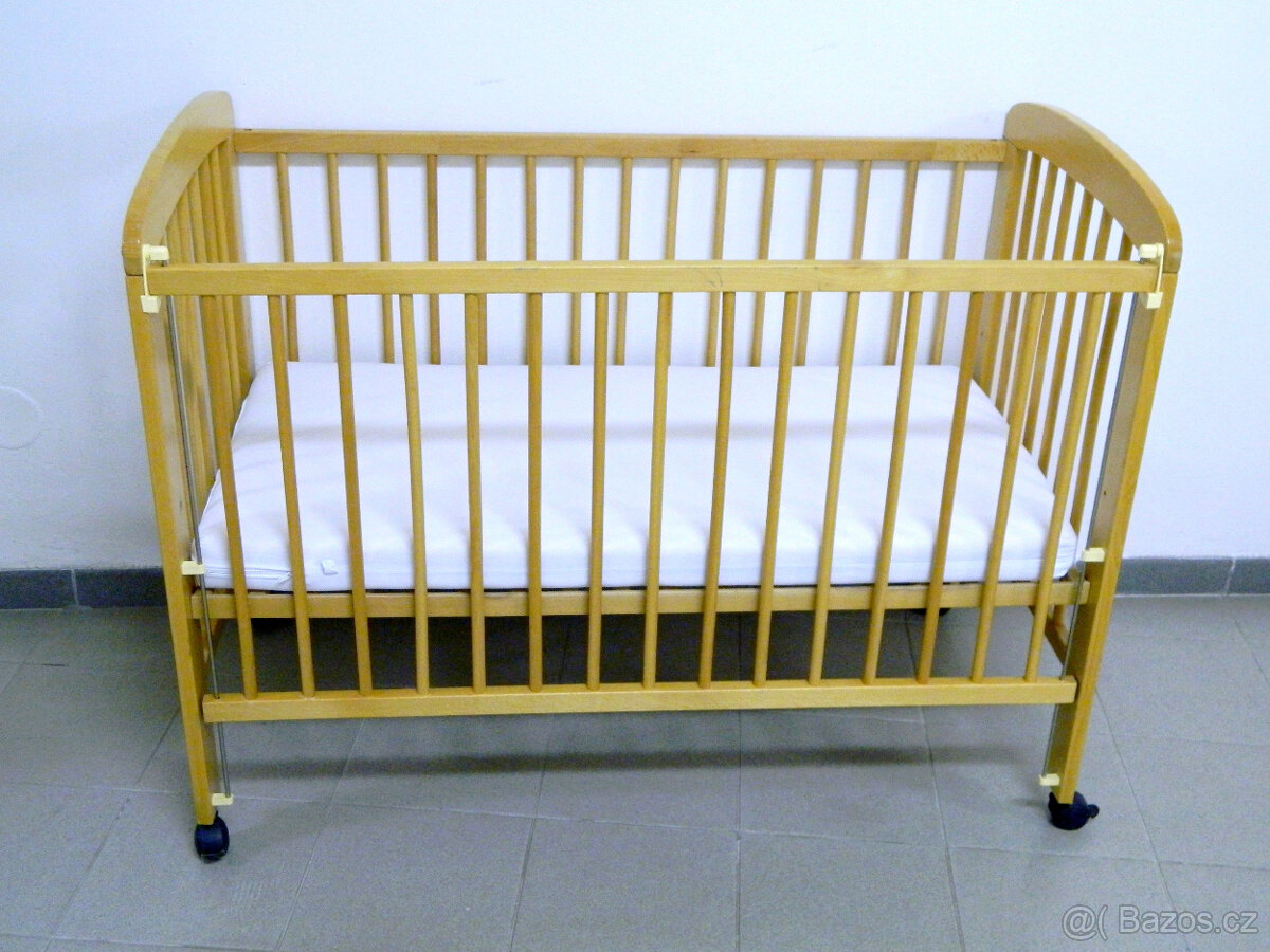 Jako nová. Rozměr: 124 x 66 cm. Potah matrace je na zip a tedy snadno pratelný. Vypraný. Nastavit lze tři výšky roštu. Osobní převzetí.