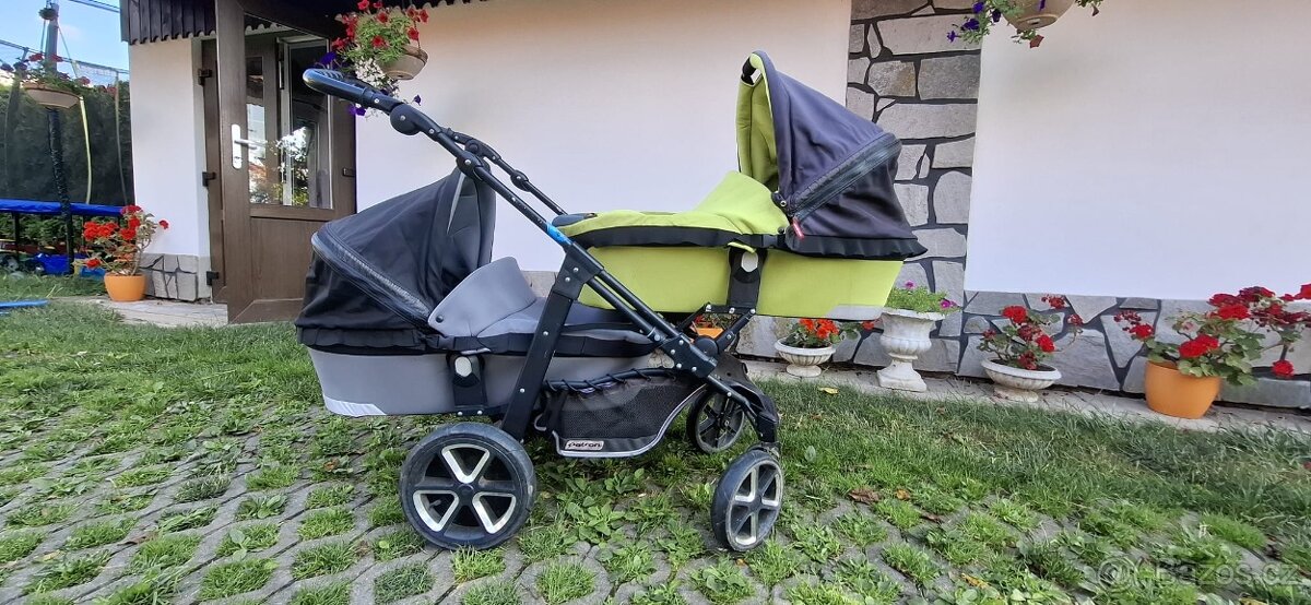 Pouzivany sourozenecky kocarek zn.Patron. Možné pouzivat pro dvojcata, pro sourozence a lze i jako jednokocarek (posunutim korby dopredu je mozne vytvorit dole i prostor jako stupatko pro starsi ditko).