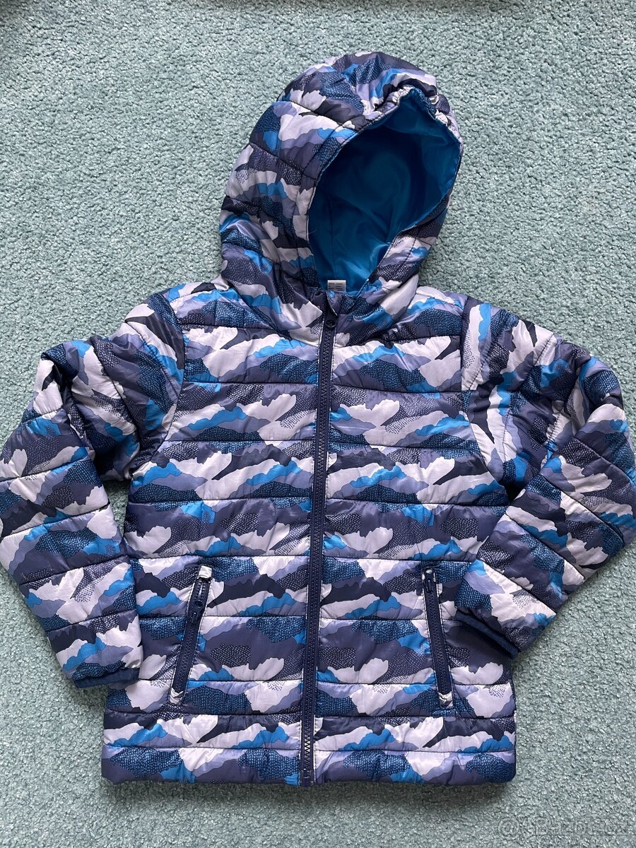 Krásná bunda Lupilu, velikost 116, ale je nositelná déle. V bezvadném stavu, jen na zádech u spodního lemu je natržená (viz poslední fotka) - syn zavadil o větev.