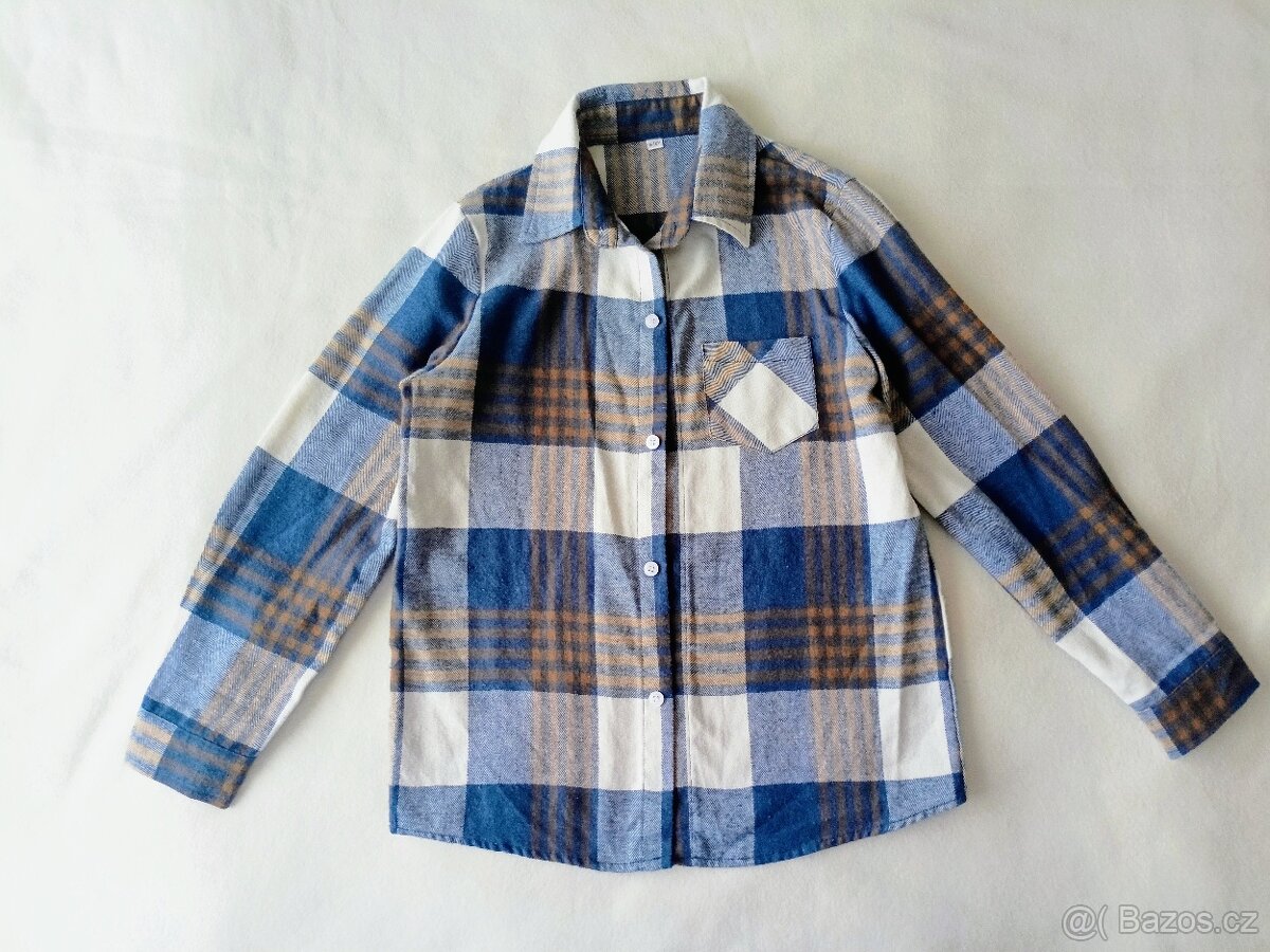 Prodám dětskou košili, vel. 128/134 s dlouhým rukávem v moderním kostkovaném vzoru (kombinace modré, hnědé a krémové barvy). Košile je vyrobena z příjemného a pevnějšího materiálu, ideální do školy i pro volný čas.