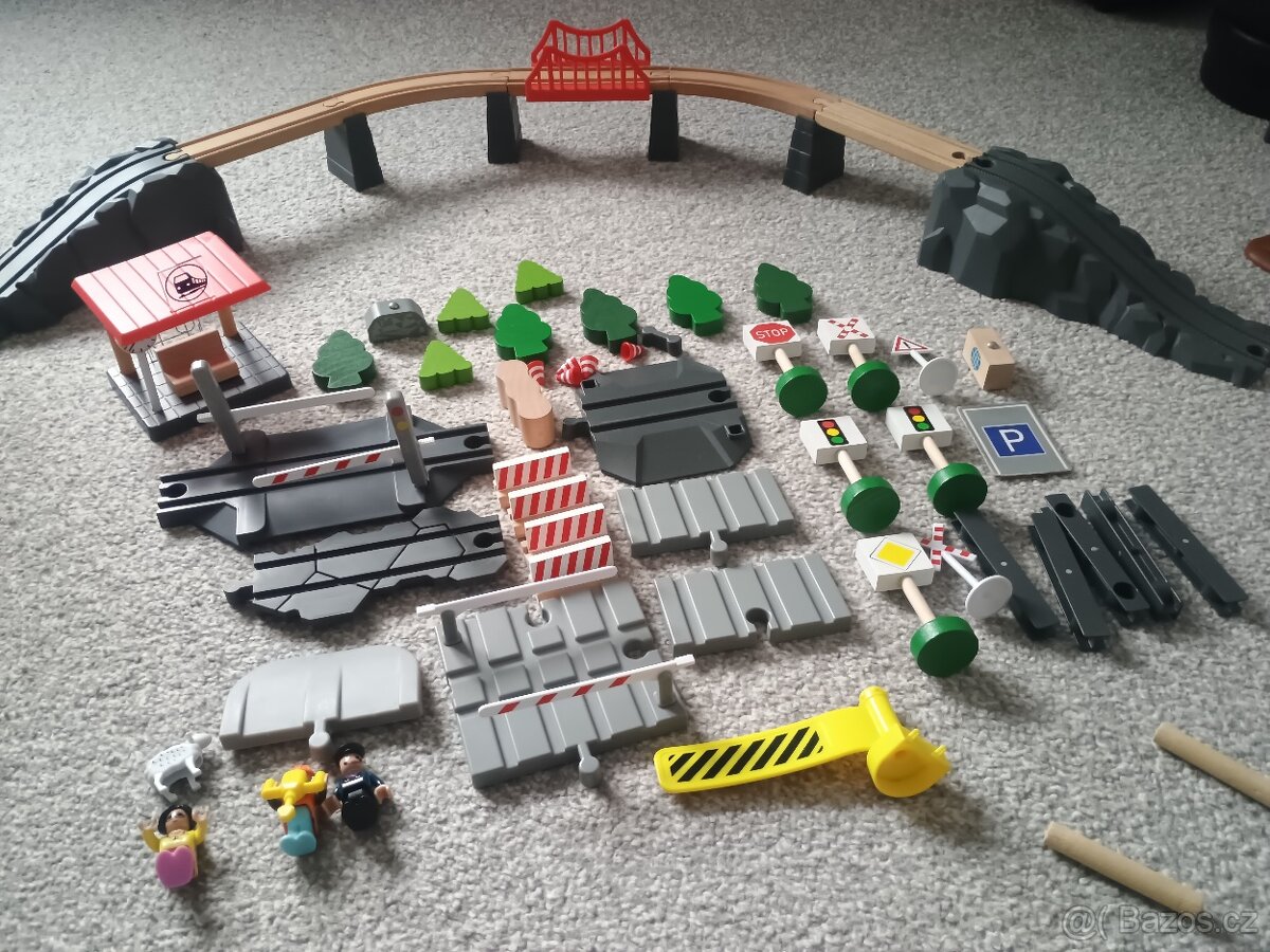 Dřevěná vláčkodráha - [17.2. 2026]Velké množství kolejiva, mosty, závory, mašinky- dva sety elektrické, auta, vagóny...vše i s boxem.