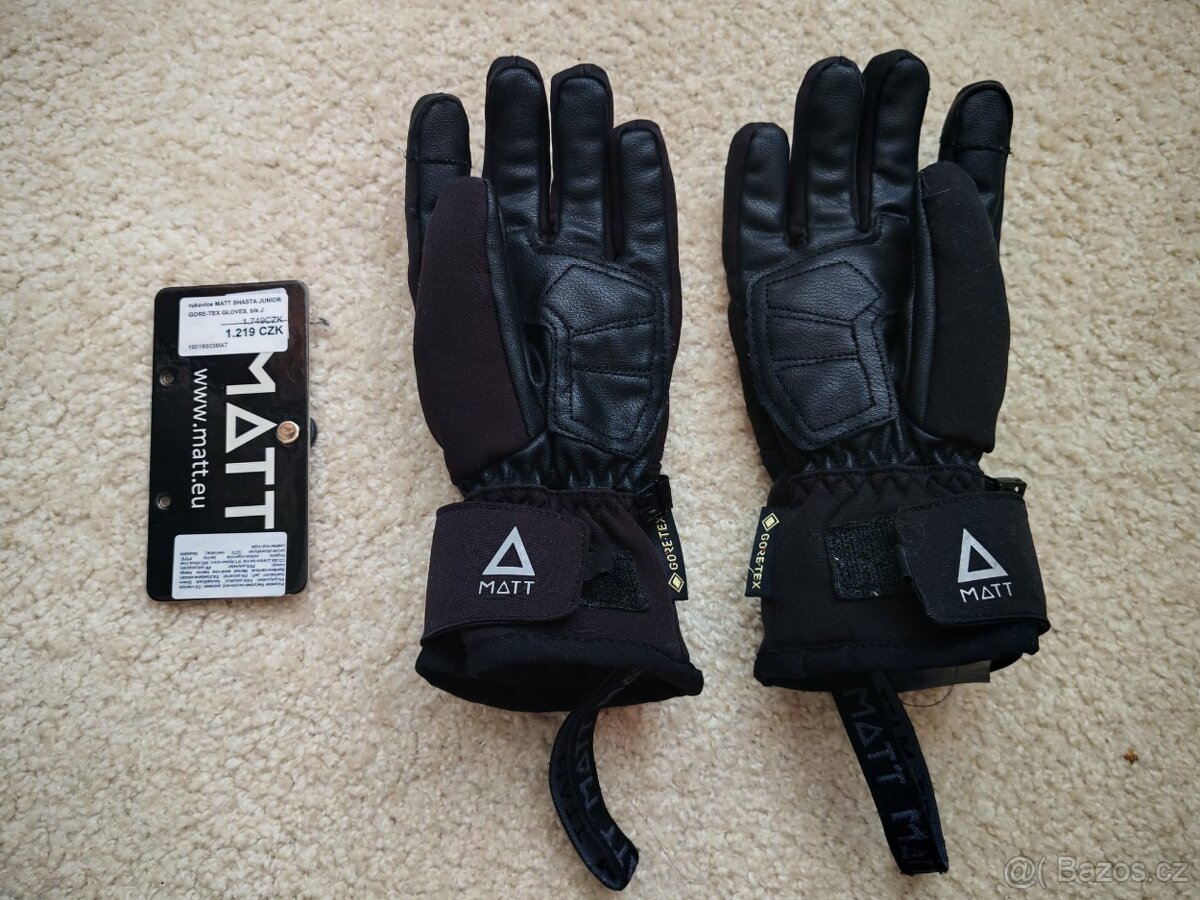 30) rukavice lyžařské, zn. Matt, sofstheel svršek, membrána Goretex, syntetická izolace, zpěvněná dlaň a vnitřek palce, stahovací manžeta suchým zipe, elastická poutka pro zavěšení, vel. 8 JR, cena 890 Kč (nové Kč 1490)