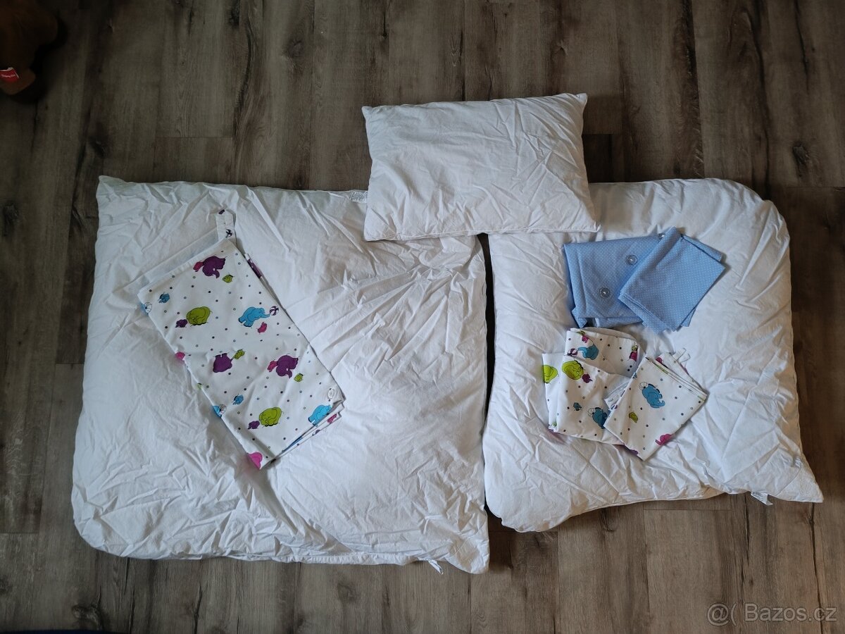 Součástí jsou dvoje povlečení - slunata a modré s puntíky (povlak jak na peřinu/zavinovacku, tak i na polštářek)