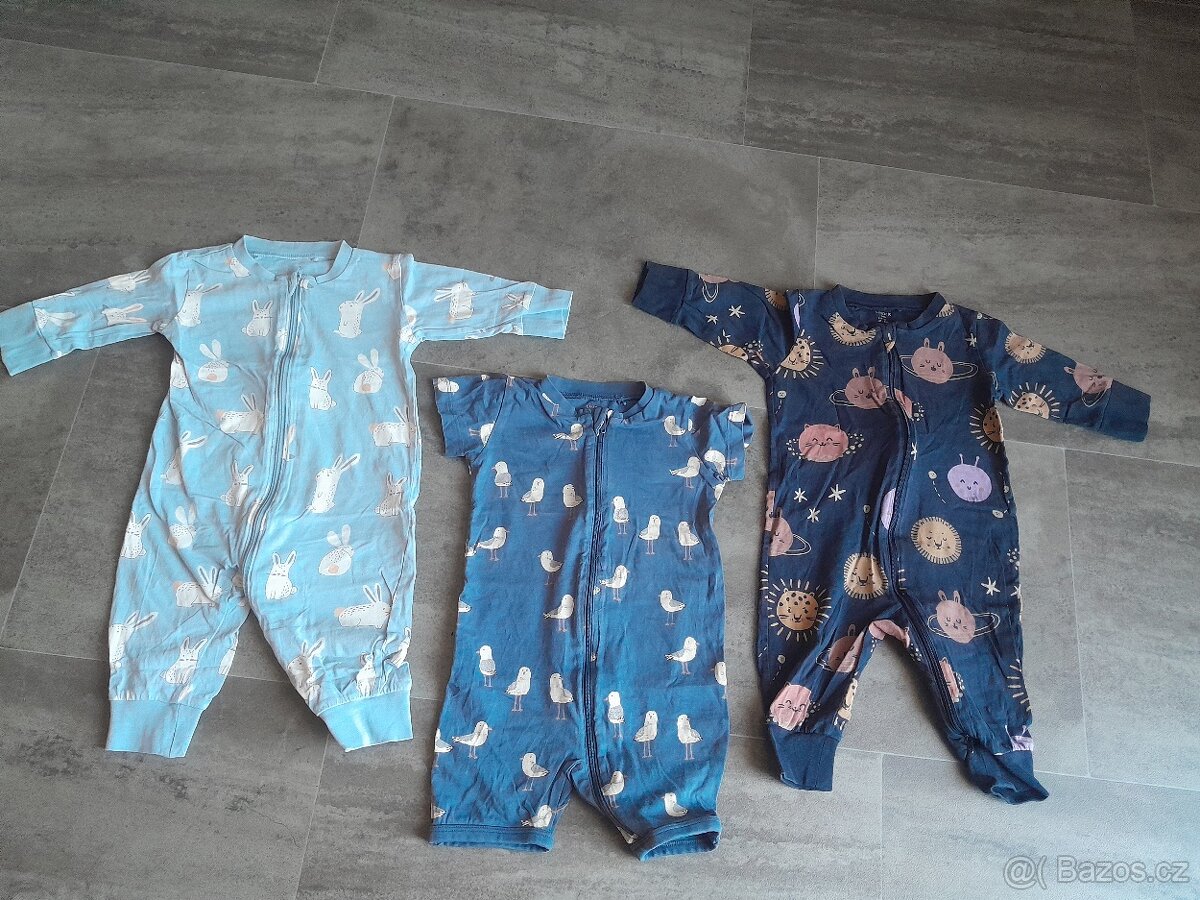 Mimozemšťané - vesmír (tmavě modrý, dlouhé nohavice) vel.68. Ptáčkové (modrý, krátké nohavice) vel.74.