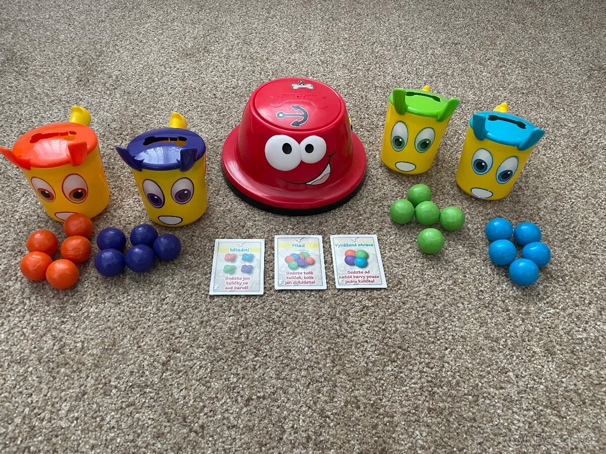 Hra Nakrm pejsky - od 3.let, jakmile pejskova miska přeteče a kuličky se rozutečou do všech stran, musíte jich co nejvíce posbírat a sníst. Pozor na kartičku, ktera určuje, zda máte sbírat pouze kuličky své barvy, od každé barvy jednu či vše, co vám zrovna přijde do tlamy. Cílem je být co nejrychlejší případně mít co nejvíce kuliček