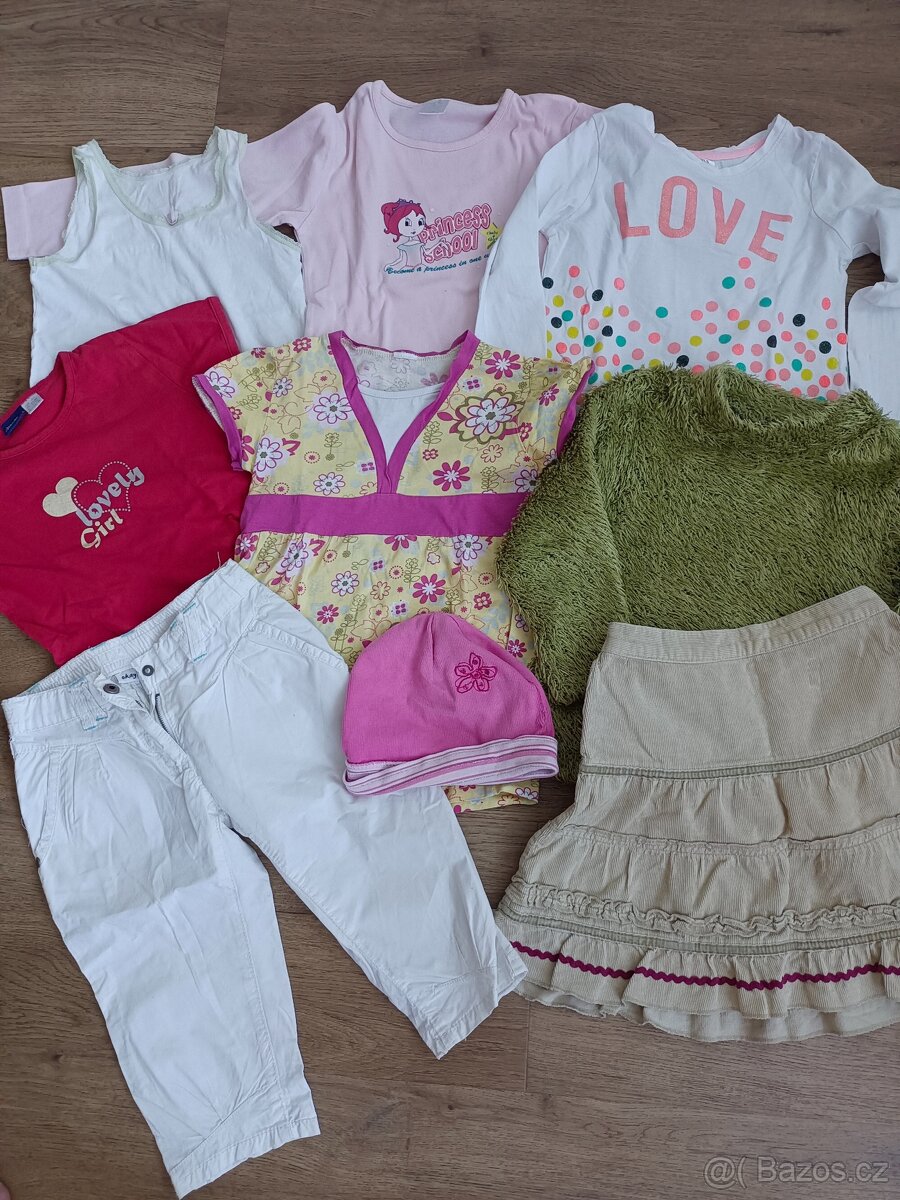 Nabízím pěkný set pro holčičku vel. 110/116. Set obsahuje 2x tričko s dlouhým rukávem, 2x tričko s krátkým rukávem, 1x košilku, 1x svetřík, 1x sukni, 1x kraťasy a 1x čepičku. Věci jsou nošené, ale v dobrém stavu. Osobní odběr v Praze 5 nebo zaslání přes Zasilkovnu či Češkou poštu.