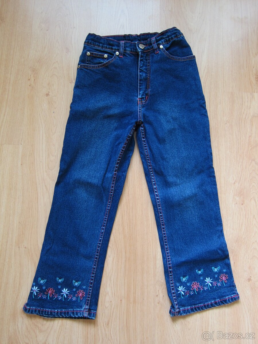 Dívčí rifle (džíny) velikost 122. Tmavě modré s vyšitými kytičkami, jako nové, bez vad, málo nošené, mají regulaci v pase. Materiál 100% bavlna.