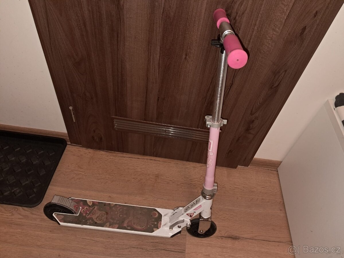 koloběžka dětská Decathlon, 3 roky jetá, věk cca 6-9, velikost: výška říditek 67-86 cm (nastavitelné), délka plochy stupačky 33 cm, vzdálenost od středu kola do středu kola 59 cm, brzdí se na zadním kole. Bílo-růžová.