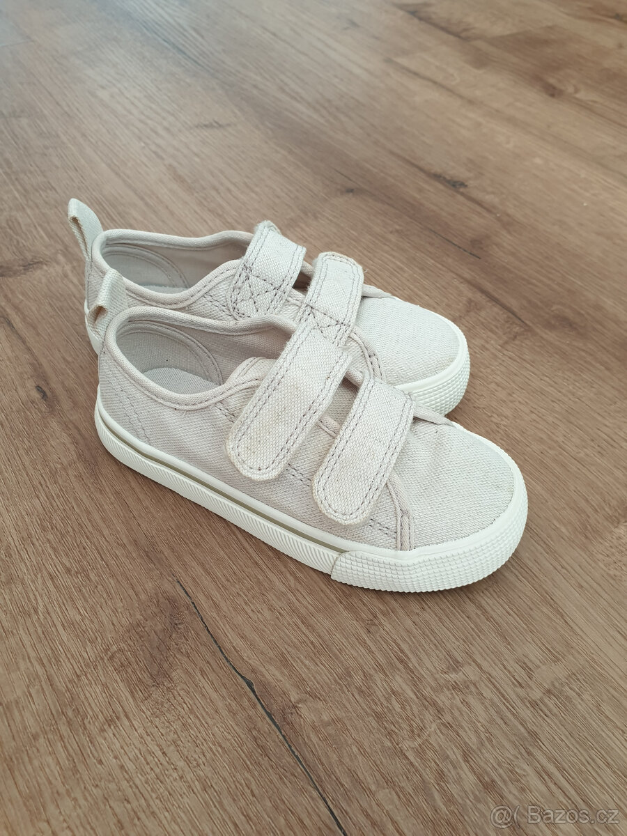 Plátěné tenisky na suchý zip, chlapecké, velikost 25, barva Ecru. Neponičené. Použité jednou za účelem focení.