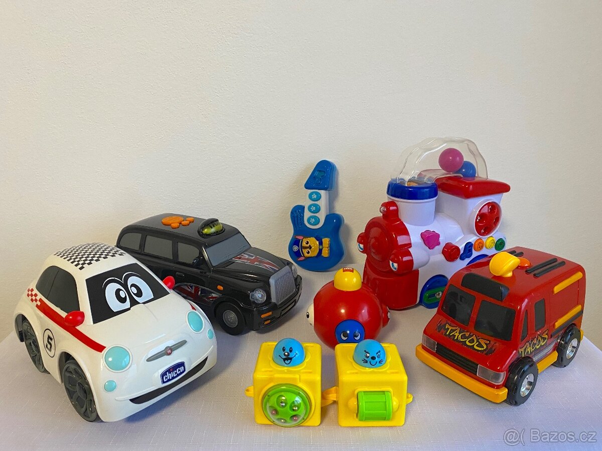 Prodám sadu hraček. Tři auta, lokomotiva a kytara jsou na baterky a po stisknutí tlačítek svítí a vydávají zvuky. Cena za komplet.