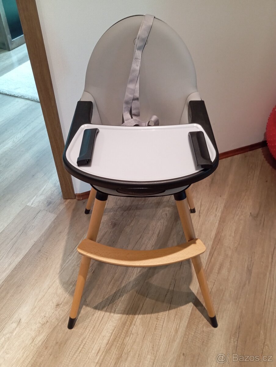 Detska jidelni zidlcka - [24.2. 2026]Detska drevena zidlicka - jidelni krmici zidle pro dite. Drevena s plastoym pultem. Celkova vyska 93cm.Tribodovy pas.