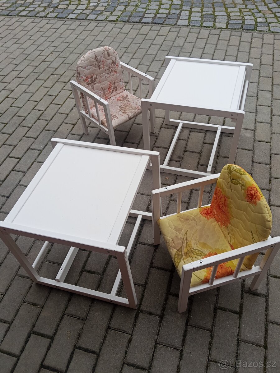 Prodám židličku se stolečkem lze rozebrat jako zidlička a stolek a nebo jako vysoká židle ,pasuje k jídelnímu stolu,mám dvě mohu prodat jednotlivě,info na tel.724094545