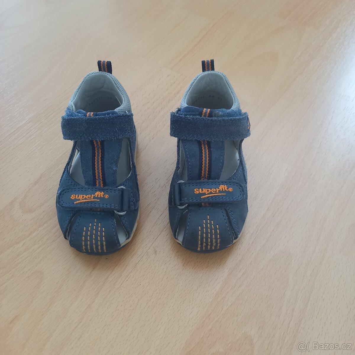 Prodám chlapecké kožené sandály Superfit ve vel. 21, modré barvy s oranžovým zdobením. Plná pata, plná špička, zapínání na dva suché zipy. Ve velmi dobrém stavu. Osobní odběr Plzeň, Praha Zličín, možno zaslat (Zásilkovna).