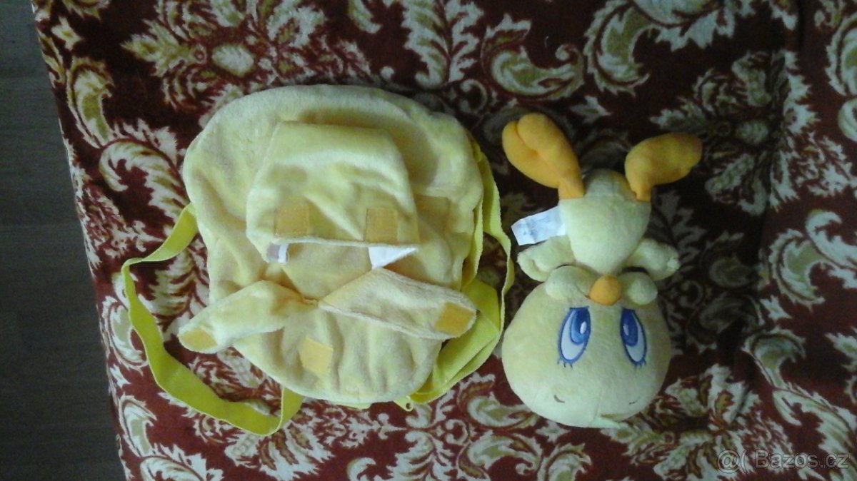 Prodám pěkně žlutá dětský batůžek s kačátkem, které lze z batůžku vyjmout a použít jako hračku. Nepoškozený, bez vady.