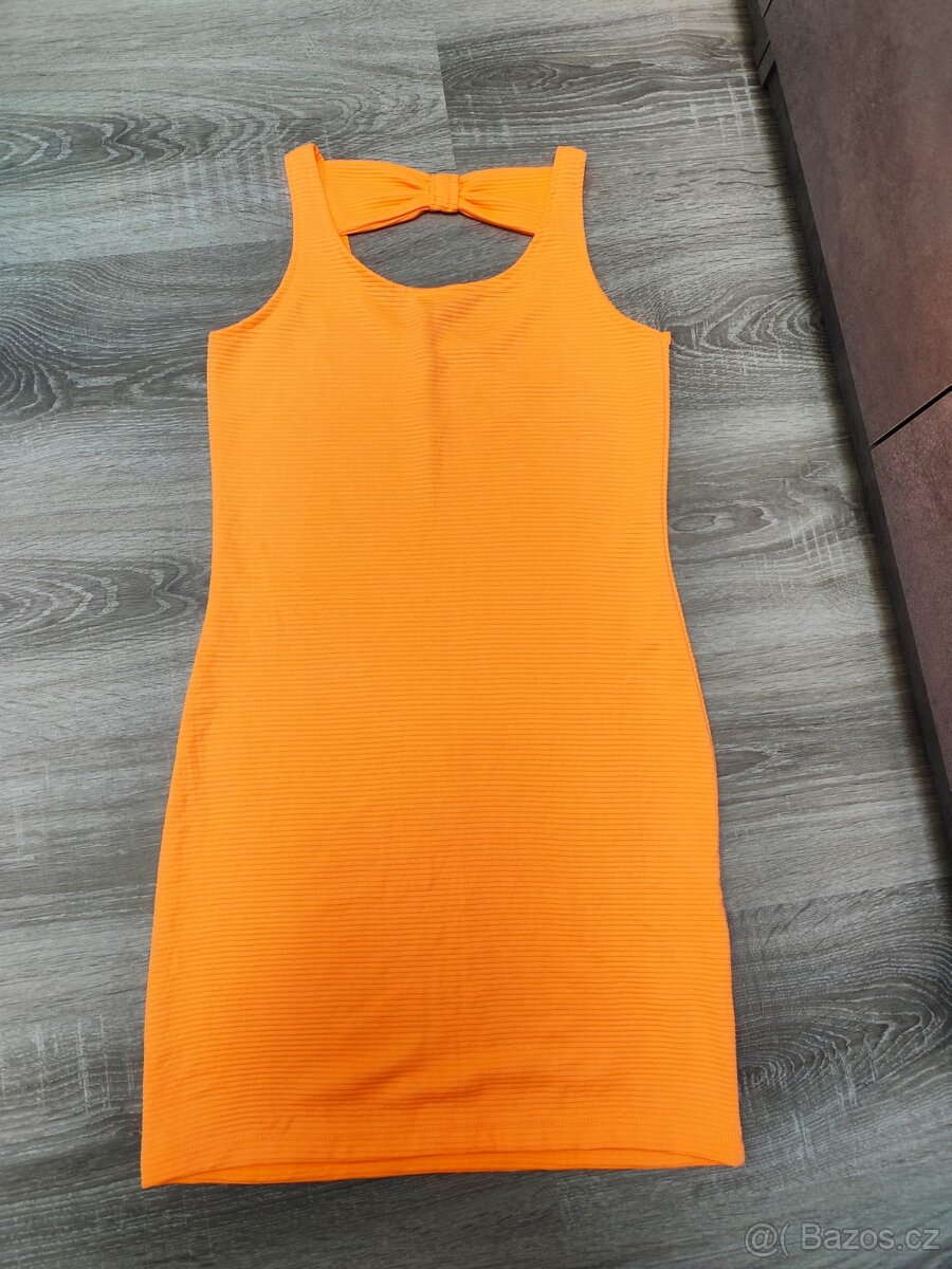 Oranžové šaty neonová barva značky Atmosphere vel.6 tj. 32. Délka 85 cm, pres prsa 43-44 cm, v pase 43 cm ..dvě ...