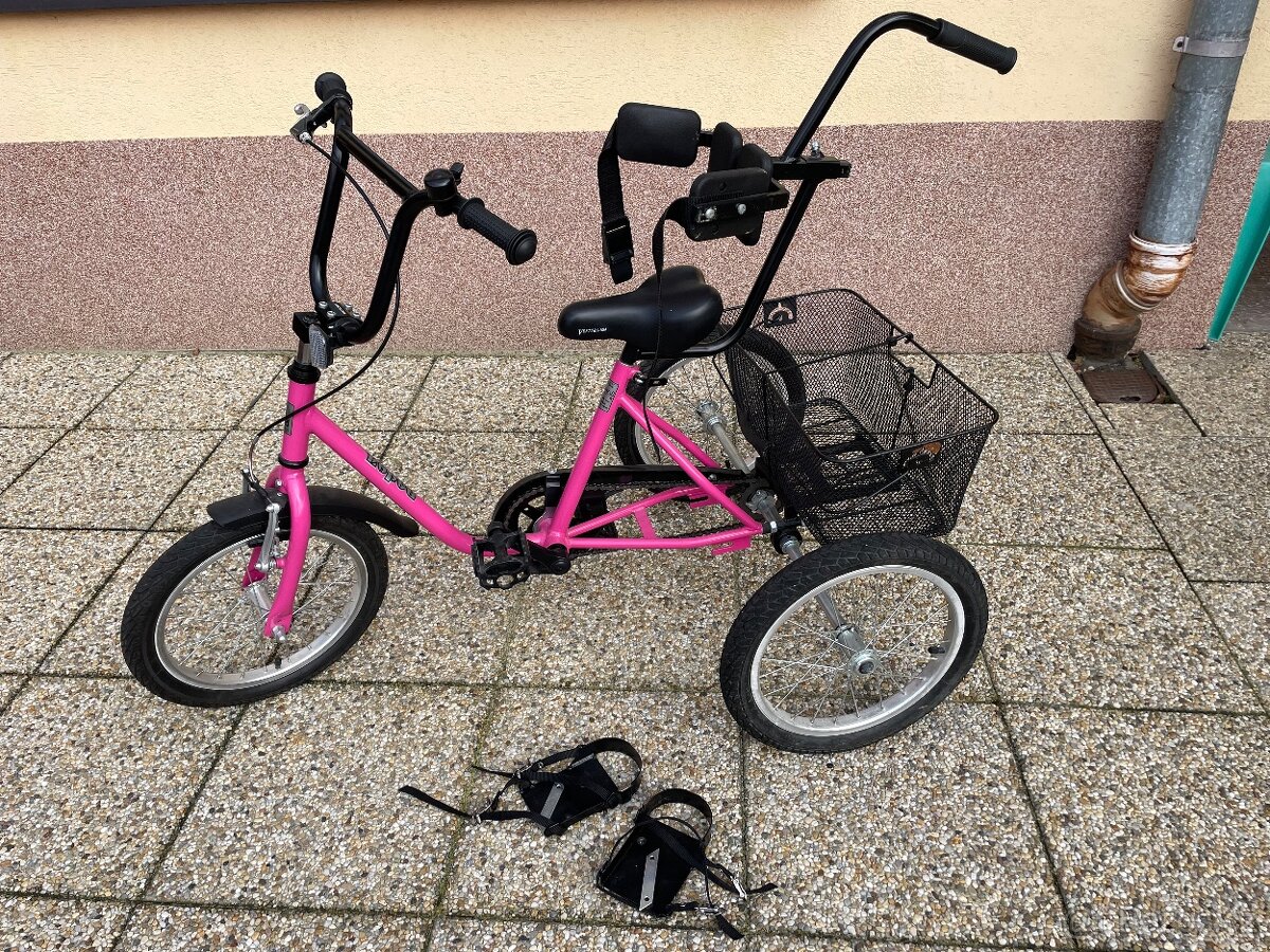 Má slušnou výbavu klipsny na pedaly s řeminky, sedadlo s ohradkou a pásem, madlo tyč pomocná, brzdy, košik