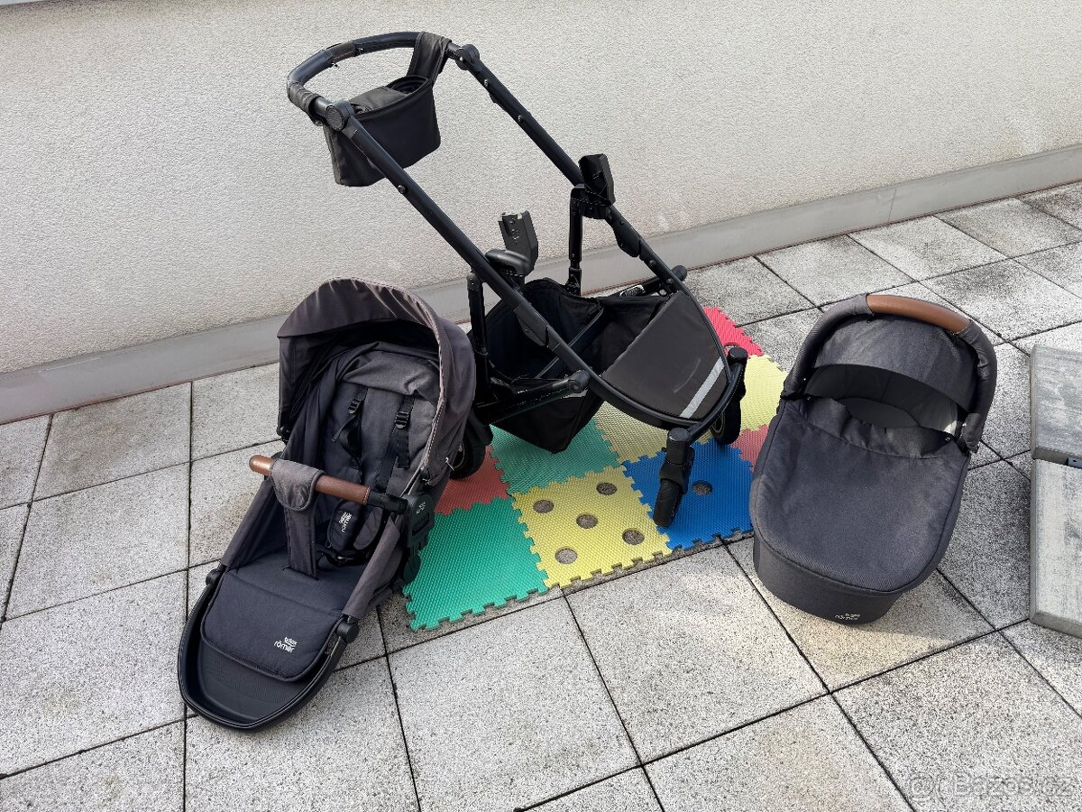 Dvojkombinace v pěkném stavu, oděrky z běžného užívání, oloupaná koženka na rukojeti, po jednom dítěti, součásti originál pláštěnka a organizátor na rukojeti, lehký, snadno ovladatelný, nástavce na vajíčko