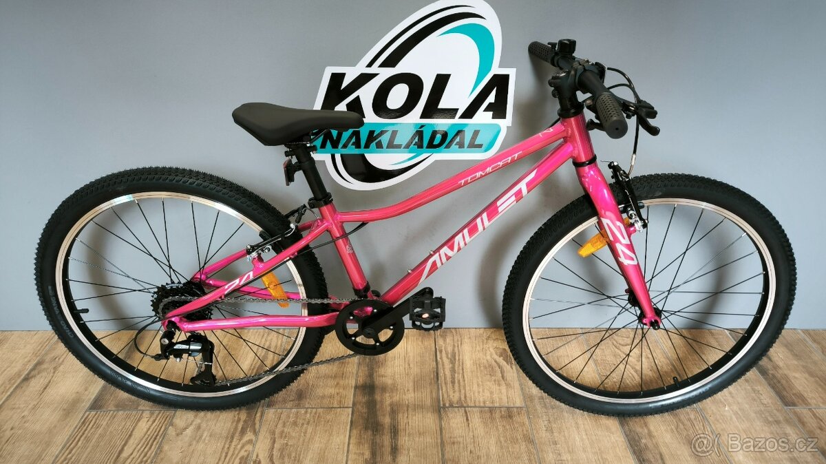 Nové dětské kolo české značky Amulet, ve dvou barevných provedení, kola průměr 24" rám Al. pevná vidlice Al. Řazení Shimano Rapidfire 1x8 přehazovačka Shimano Acera, kliky 32T, kazeta 11-32, brzdy V-brake. Váha 8,5kg. Pro děti velikosti cca 115 - 135cm. Doporučená cena 10.999,- sleva -20% cena 8.799,-