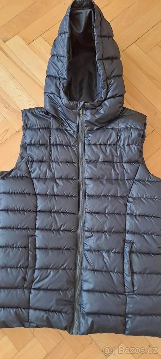 Teplá prošívaná tmavě modrá vesta s kapucí, zapínání má hezky ke krku. Super stav. Je dívčí, ale nosil ji syn. Vel.158/164.