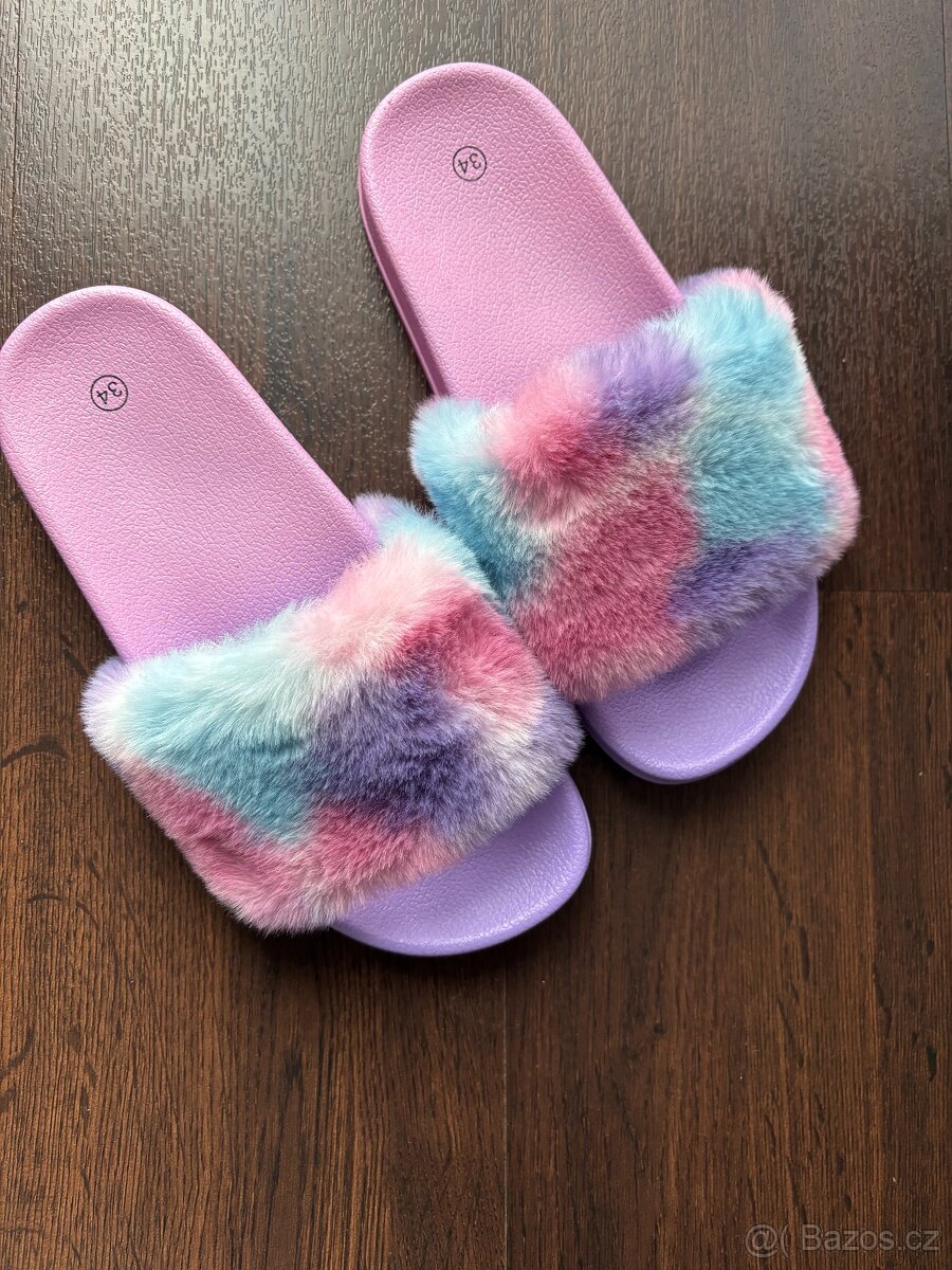 Jako nové, nošeny pouze občas doma. Velikost 34 odpovídá. Duhové pantofle 34.