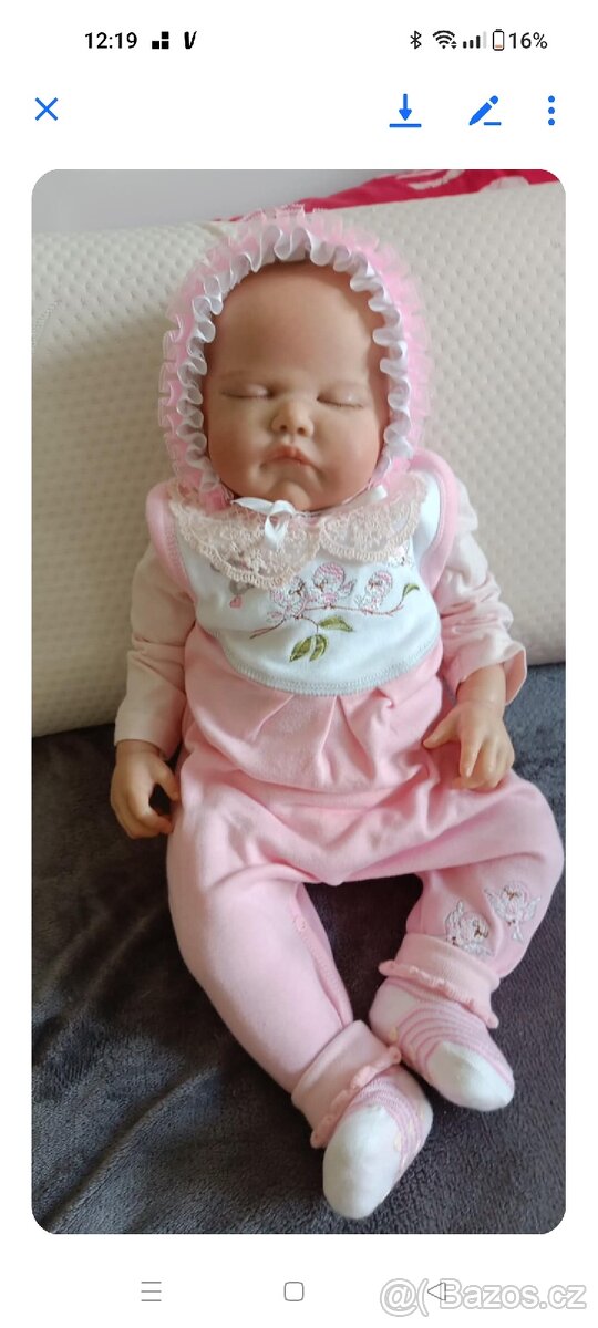 Prodávám ze své sbírky tuto luxusní reborn panenku, rebornovaná v Anglii,má certifikát,měří 55 cm,váží přes 3 kg,plné končetiny,jedna nožka pokrčená,má magnetický dudlík,malované vlásky,břišní plát je jen přes bříško přijde hezky oblečená,oblečky na fotu jsou ilustrativní.Lze poslat balíkovnou ,kterou hradím já.Prosím pouze vážné zájemce.Tento kit je již nesehnatelný.