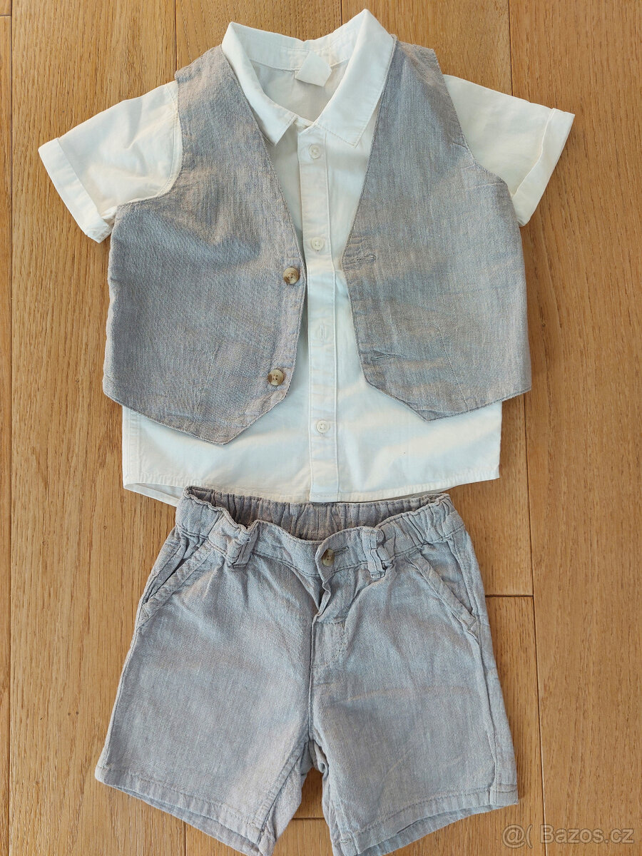 Prodám letní elegantní soupravu pro kluka zn. H&M, vel. 80 (větší, unosí se i jako 86). Košile je bavlněná, vesta a košile je bavlna + 55% len. V top stavu, oblečeno dvakrát.