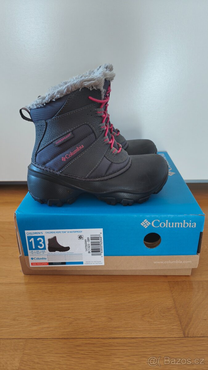 Prodám dětské zimní boty Columbia vel. 31, délka stélky 18 dle tabulky výrobce. Krásný stav bez jakékoliv vady. Koupené v listopadu 2025.