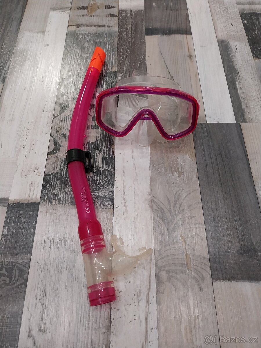 Prodám dívčí šnorchl a brýle Aquos. Kupované nové, použité asi 10x na dovolené a teď už bohužel malé. Rozměry viz.foto. Osobní odběr Praha 8 Čimice, Praha 9 Kyje, zásilkovna 89kč, balíkovna 75kč.