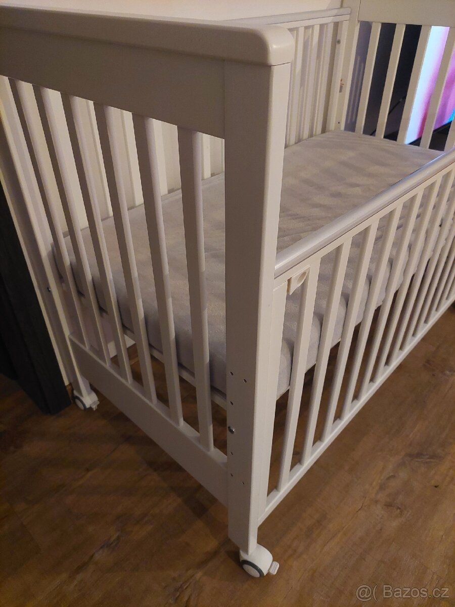 Postýlka pro matraci 120x60. Bílá na kolečkách, které se dají zabrzdit. Bočnice se dá stáhnout a oddělat, aby se přirazila postylka k posteli. Top stav. Mohu nabídnout i matraci za 1000Kč. Kvalitní, zn. Traumeland