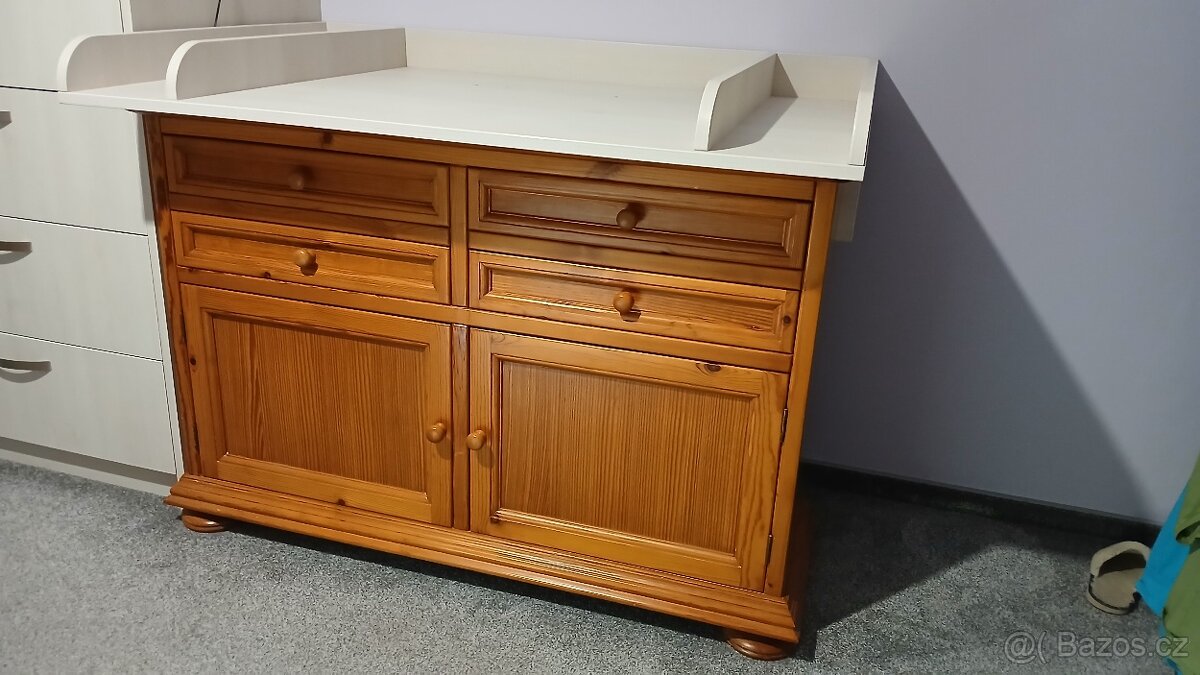 Přebalovací pult vyroben na zakázku, dekor bílého dřeva, šířka 119, hloubka 75, boky na odkládání kojeneckých potřeb mají šířku 17, prostřední část určená na přebalovací podložku má šířku 77 a hloubku 73.