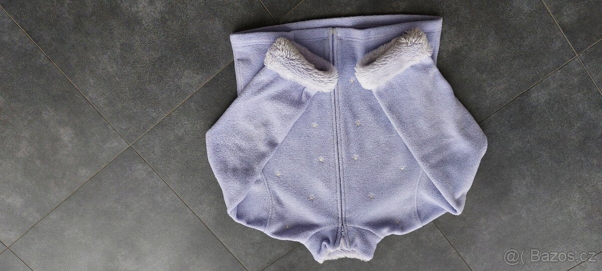 Prodám nádhernou rozepínací mikinu s chlupem u krku a na rukávech. Barva je hezká "lila". Vepředu stříbrné hvězdičky z flitrů. Dvě postranní kapsy. Velikost uvedena 158 cm/13 let. Bez vad, hezká.