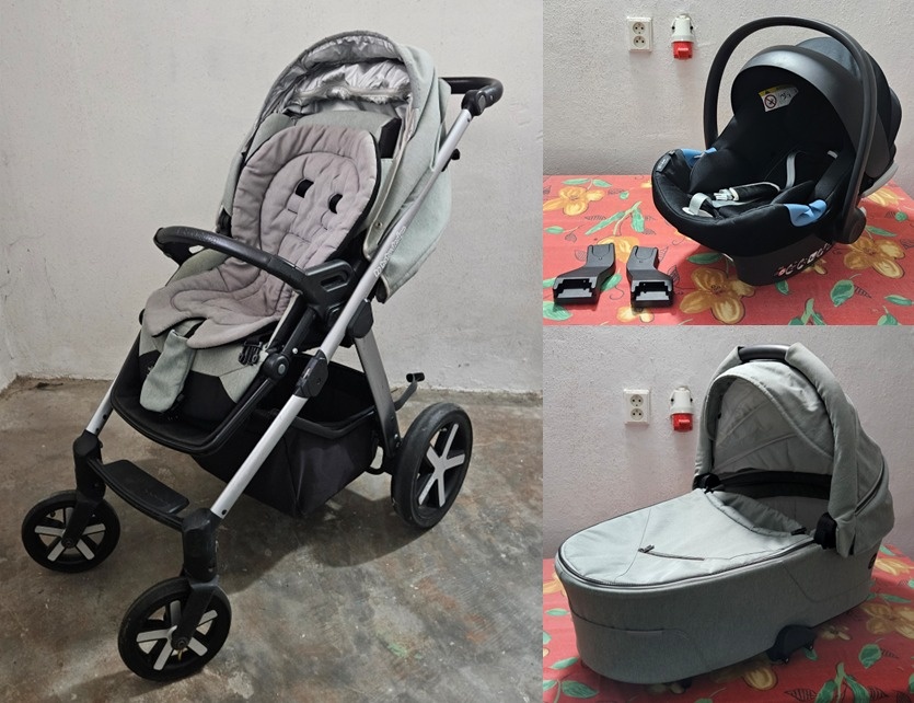 Ke kočárku jsou nástavce na autosedačku Maxi Cosi,síť proti hmyzu,pláštěnka,držák na pití, zimní návleky na ruce.