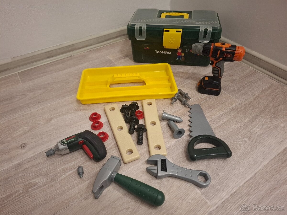 Sada dětského nářadí Bosch v kufříku, originál vrtačka nefunguje, ale možná lze opravit. Na kufru je prasklé vrchní víko, viz foto. Jinak bez vad. K tomu navíc elektrická vrtačka Black Decker s třemi vrtáky, funkční, jako nová.