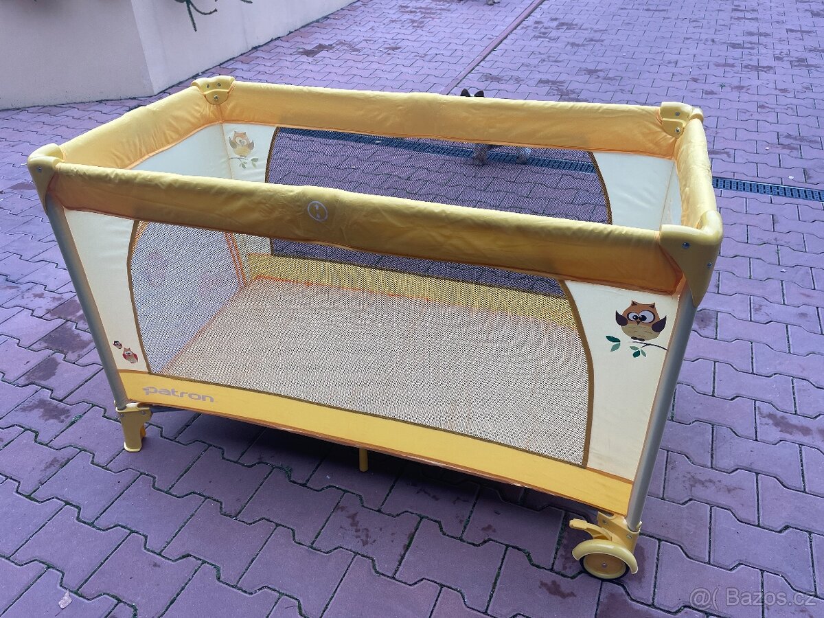 Rozměr 120x60 cm, posouvací kolečka na jedné straně, dá se složit do převozní tašky, součástí je pevné dno, na které se teprve dává matrace.