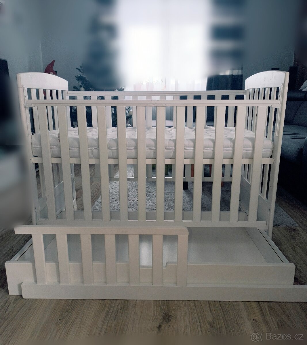 Prodám krásnou postýlku s úložným prostorem a novou matraci bok postýlky se posouvá nohoru, dolů. K postýlce je i dodatečná zábrana, když už je dítě větší a vyleze samo.